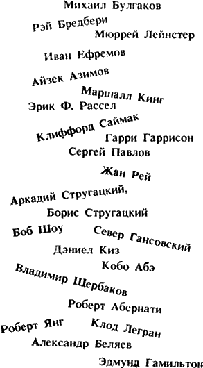 Современная фантастика не монотонна. Она пестра, как радуга, и так же плавно, как радуга, меняет цвета, переходя от реализма к самой буйной игре ума. Если бы мы попытались назвать семь основных цветов в спектре американской фантастики, то скорее всего нам пришли бы на ум имена Драйзера, Твена, Азимова, Бредбери, Саймака, Берроуза, По. А вот аналогичное семицветие для русской фантастики: Лев Толстой Достоевский Беляев Ефремов Алексей Толстой Булгаков Гоголь.